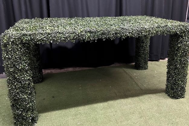 The Boxwood/Hedge Dining Table is a one-of-a-kind, custom build dining table that features faux hedge on the tabletop and legs. Perfect for Weddings, birthday parties, and other events with a “Green” theme.