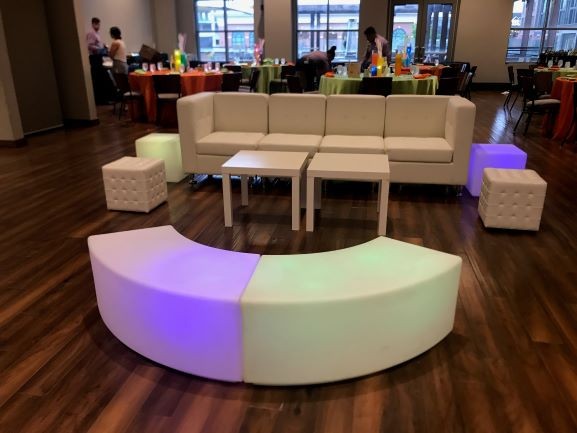 Create a memorable atmosphere for your guests to enjoy with our Lighted Curved Bench. Flash, fade, and smooth transition color options are also available for when you need something a little extra to get the party going. See also LED Lighted Cubes.